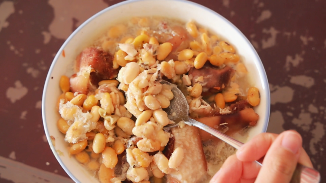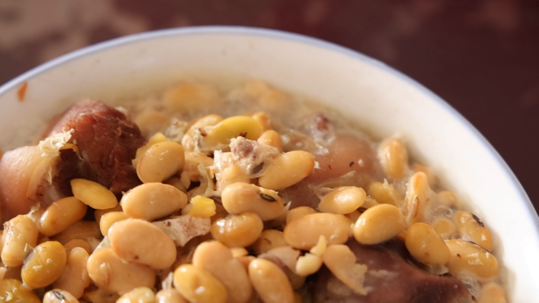 洗净的猪脚与饱满浑圆的黄豆先后入锅,用细火慢炖。灶膛里,爷爷添着柴火,眼睛盯着火苗控制火候。随着锅内热气升腾,黄豆的豆脂与猪脚的胶原在高温下相互交融,原本清亮的水渐渐变成醇厚的奶白色。黄豆在汤里翻滚,吸足肉汁的鲜味,却依旧保持完整身形。