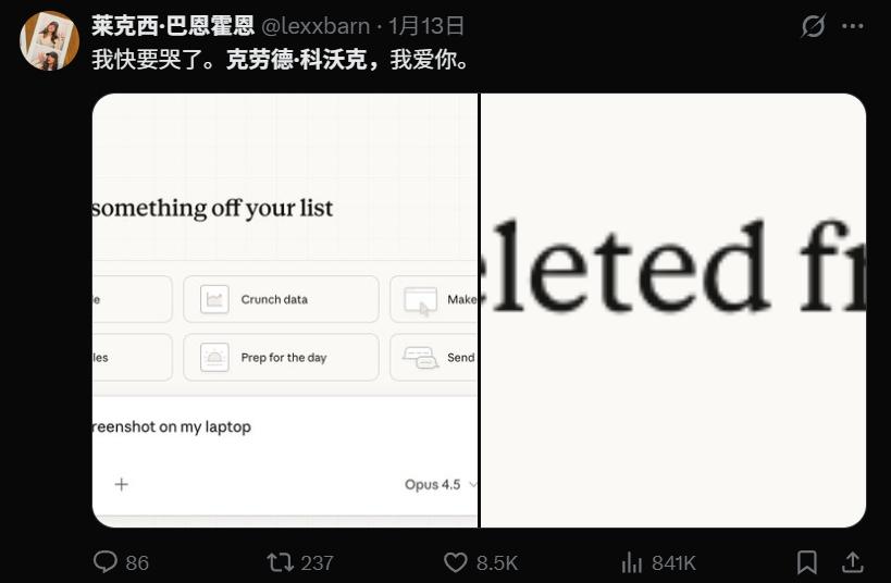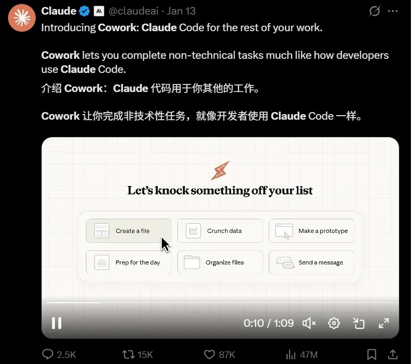 “Claude Cowork用两分钟改变了我的工作状态。”