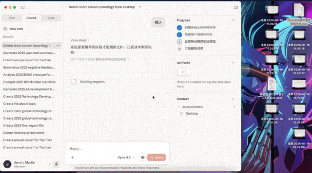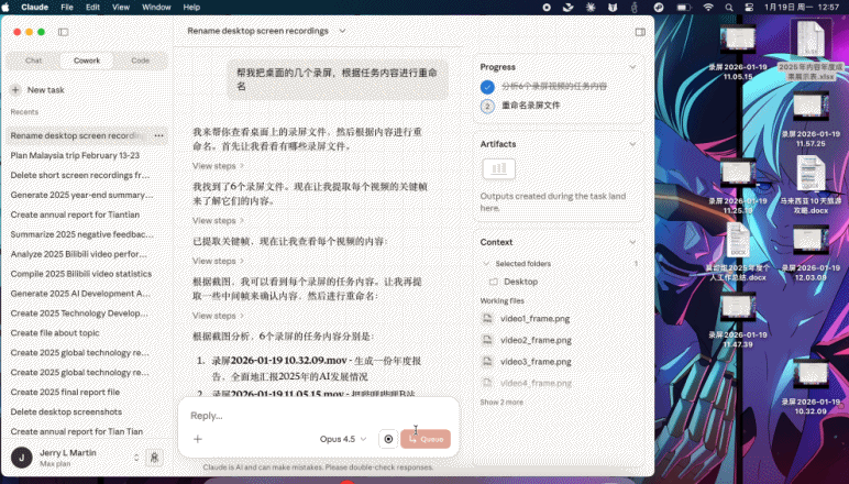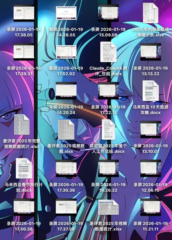 我平时是个很注重桌面整洁的人,但为了测评Claude Cowork,特意保留了一些系统默认命名的录屏文件,堆在一起确实显得很乱。