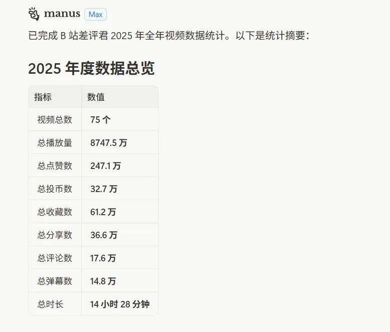 我用Manus 1.6 Max做了同样的测试,结果它只统计出75个视频的数据,总数都不对,更别说其他细节了。