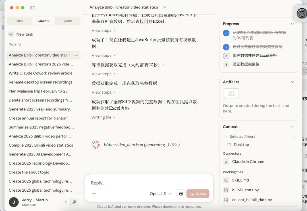 而Claude Cowork正好擅长处理这类数据收集整理的工作,虽然技术含量不高,但却十分耗时。