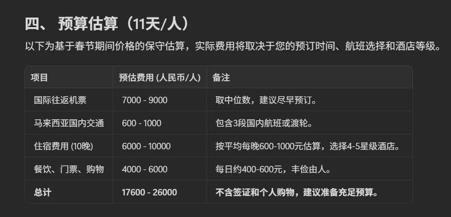 相比之下,Manus的行程预算虽然偏高,但更接近春节出行的实际价格。