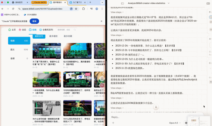 它先申请了浏览器操作权限,然后像人工收集资料一样浏览了差评君的首页。