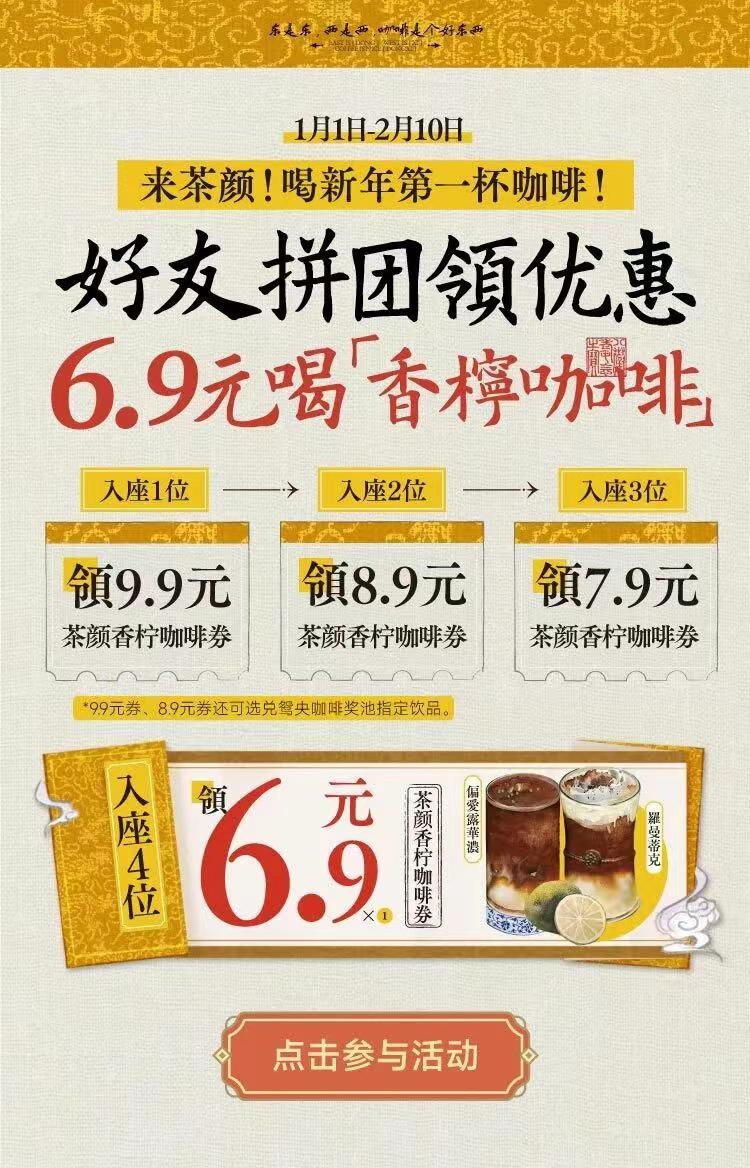 进入1月,茶颜又官宣了“开工第一杯”活动,消费者分享给好友后,最低只需6.9元就能任选一款咖啡。