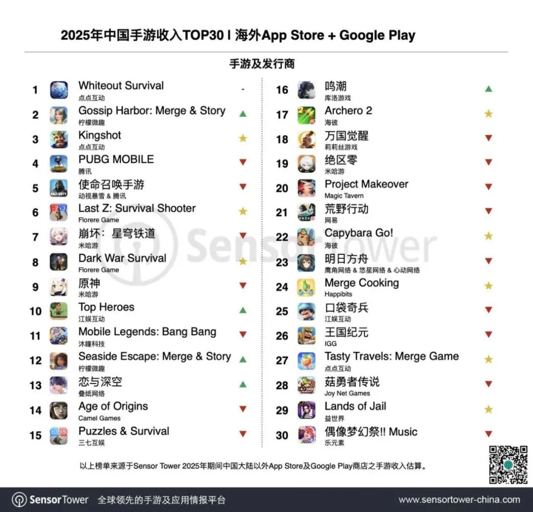 其旗下两款4X策略手游《Last Z: Survival Shooter》和《Dark War Survival》均在2025年首次入围出海手游收入榜TOP30,分别位列第6和第8,且均是该年度收入TOP30榜单新入榜的8款游戏中的前三甲。