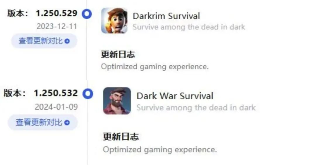 《Dark War Survival》最初名为《Darkrim Survival》,2023年10月下旬挂在「Topwar Studio」旗下(该账号属于江娱互动),但仅一个月后便下架。