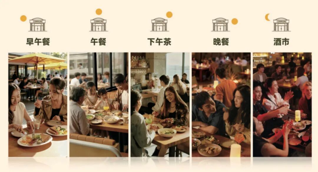 在餐饮行业,租金是恒定的,但收入往往被框死在特定的时段里。咖啡馆赚上午,餐厅赚午晚餐,酒吧赚深夜。而COMMUNE通过菜单、灯光、音乐和服务动线的精密分时设计,让一个物理空间在18小时内叠加了不同业态。