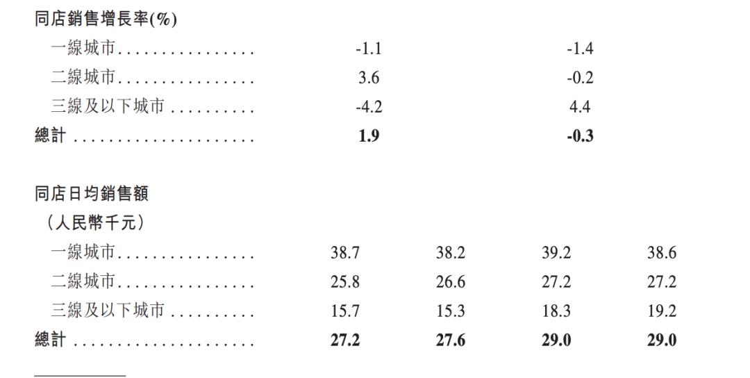 招股书显示,2024年及2025年前三季度,其一线城市门店的同店销售增长率已连续录得同比下滑,反倒是三线及以下城市保持正增长。