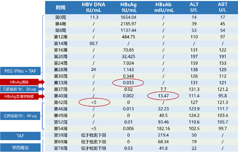 •42周:HBV DNA转阴,为提升HBsAb水平注射60μg乙肝疫苗3针