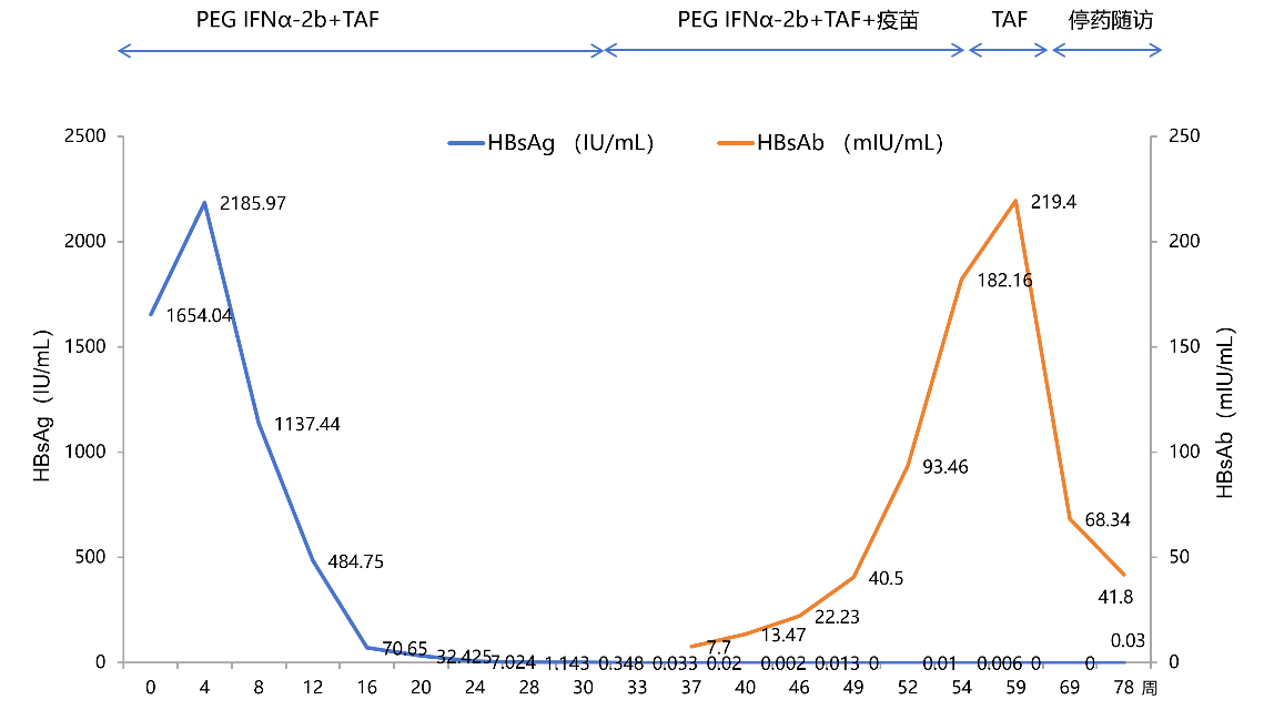 本例为48岁女性患者,HBsAg阳性15年,有肝癌家族史,服用NAs约14年。为追求临床治愈采用PEG IFNα-2b + TAF联合治疗,40周实现HBsAg血清学转换。后续注射4次乙肝疫苗提升HBsAb水平,因多药联用引发重型ITP暂停PEG IFNα,经积极治疗未影响乙肝疗效,63周停药后随访仍维持良好效果。