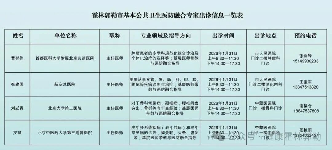 原标题:《霍林郭勒市基本公共卫生医防融合专家出诊信息》