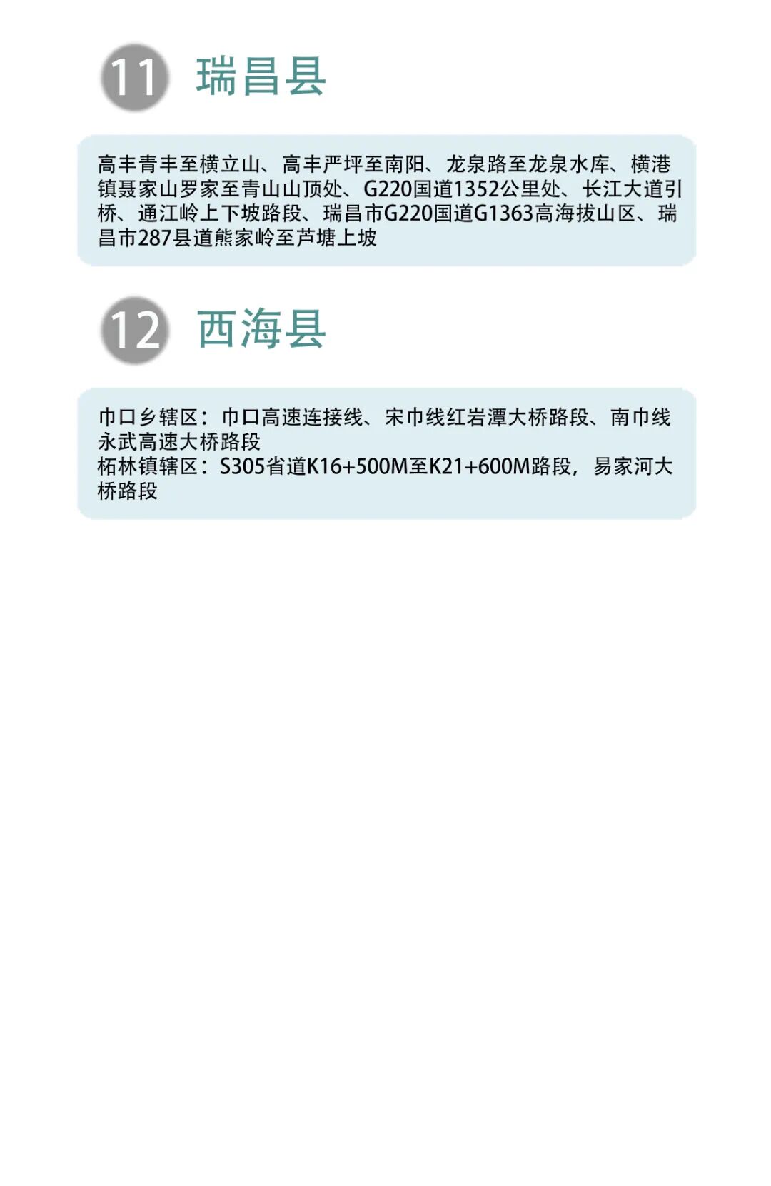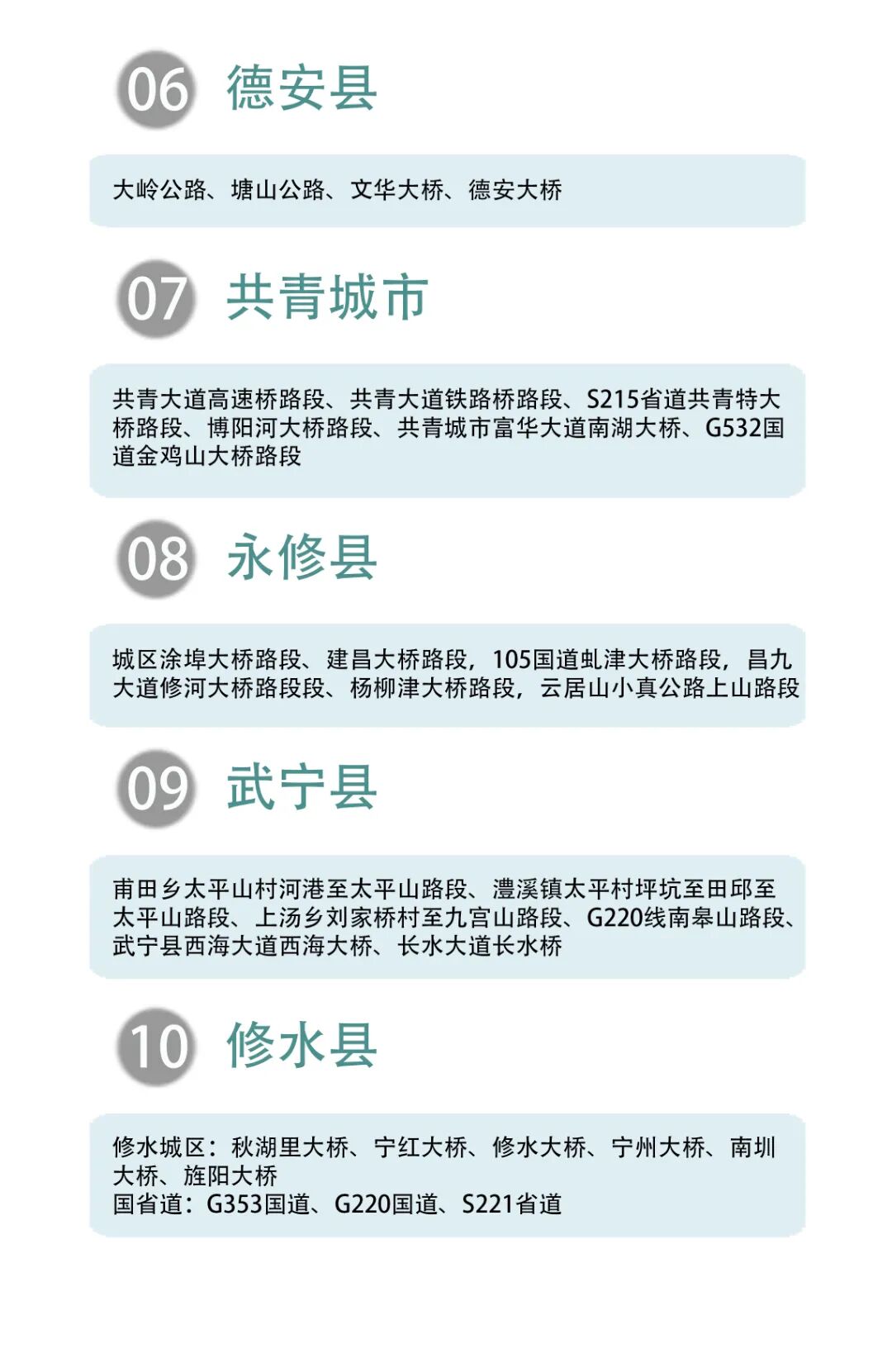 庐山大道高垅桥路段,芳兰大道一桥、二桥,昌九快速路九江收费站至天池路高架桥路段,九湖路液化气公司路段,G105国道映日荷花至双塔路口,G105国道1550——1551+300米处等路段。
