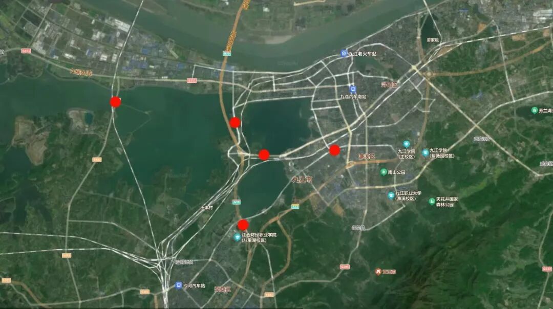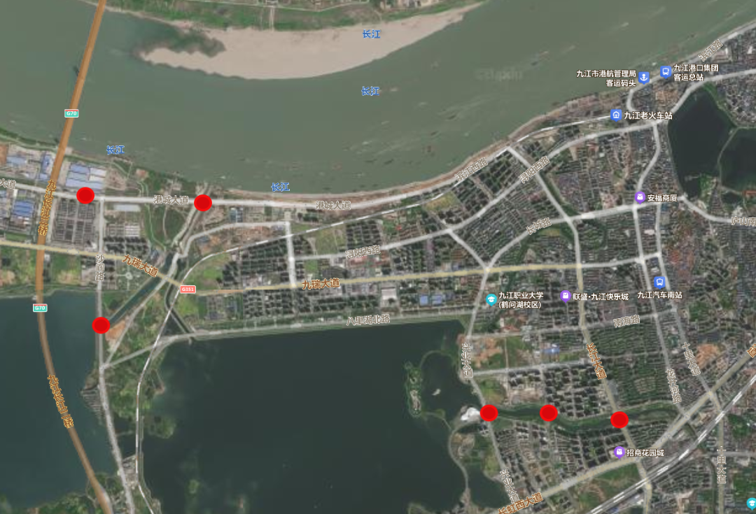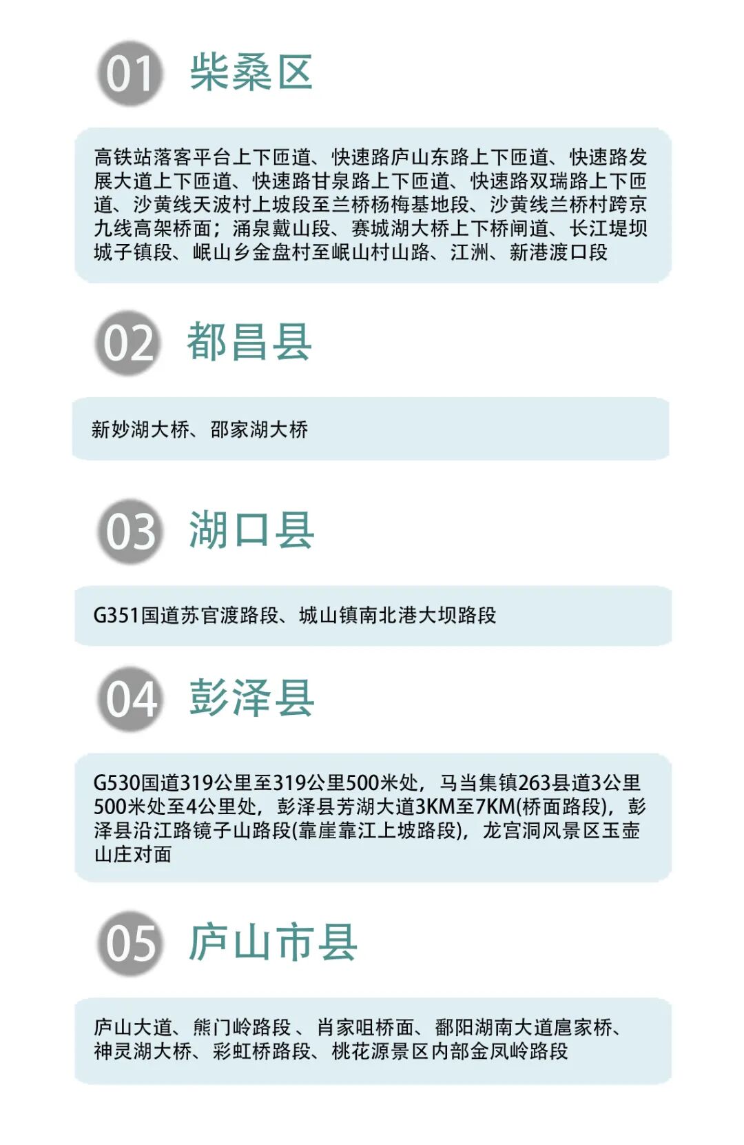 长江大堤(九鼎码头-王家堡路段)、九瑞大桥、长江大道九江南快速路口及长江大道立交桥等路段。