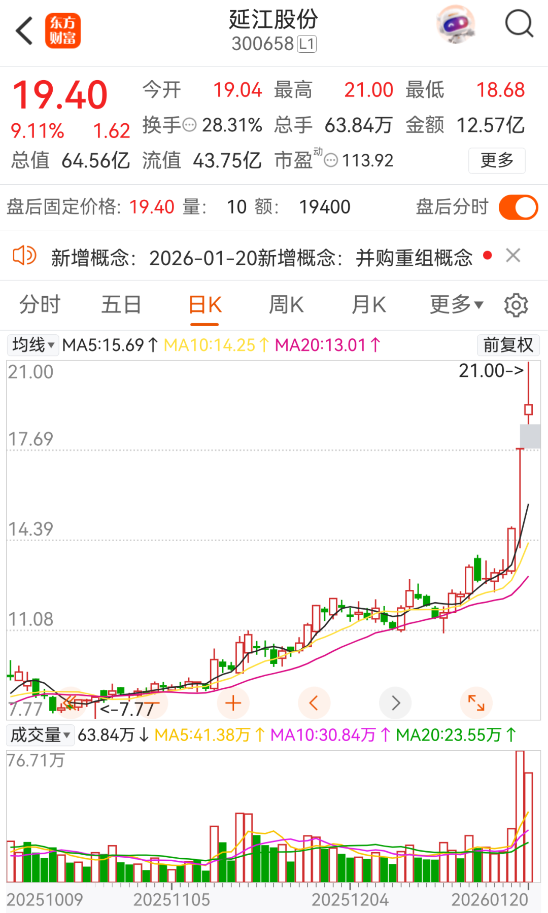 受此消息刺激,延江股份1月19日复牌后收获20%涨停,1月20日再度上涨9.11%。