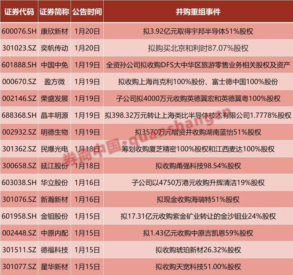 受监管政策影响,A股并购重组市场活跃度持续提升。1月15日以来,康欣新材、盈方微、荣盛发展、延江股份、民爆光电等10余家公司相继披露并购重组进展。分析人士认为,未来科技行业并购或成常态,央国企重组及跨行业并购也有望更加频繁。