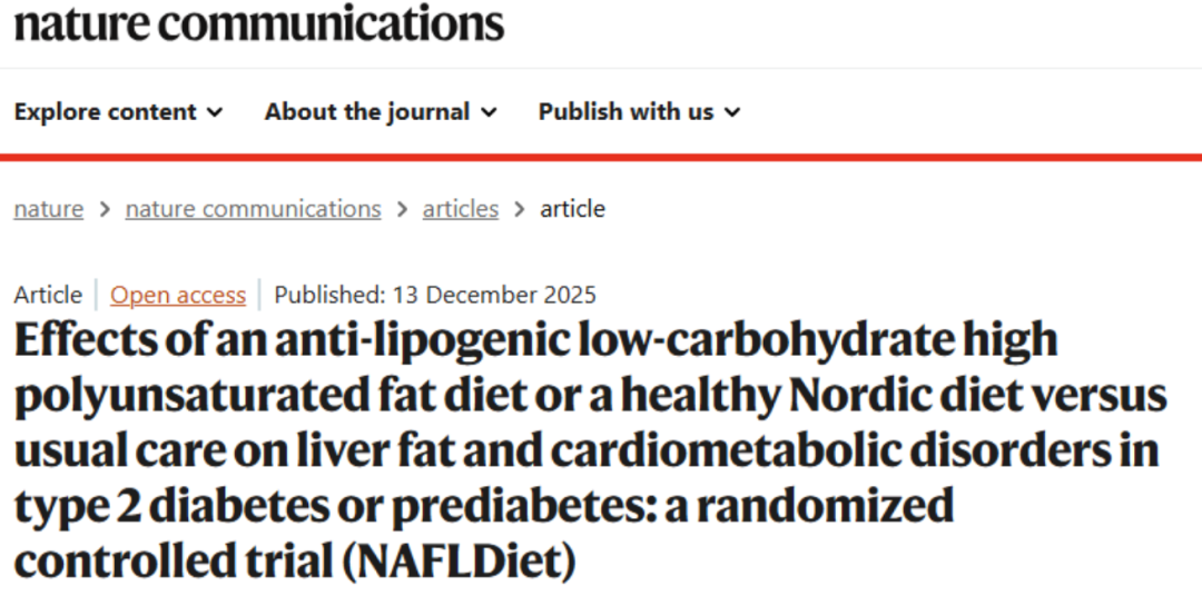①Fridén, M., Rosqvist, F., Kullberg, J. et al. Effects of an anti-lipogenic low-carbohydrate high polyunsaturated fat diet or a healthy Nordic diet versus usual care on liver fat and cardiometabolic disorders in type 2 diabetes or prediabetes: a randomized controlled trial (NAFLDiet). Nat Commun 16, 11130 (2025).