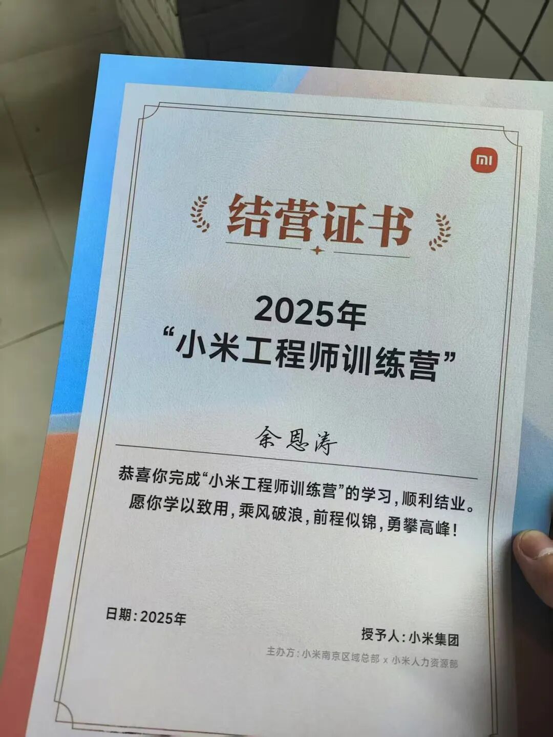 余恩涛:研二暑期7月参与小米工程师训练营,日间学习核心知识、晚间复盘作业,完成项目设计与报告,答辩后获小米Offer;后续参加字节跳动客户端开发训练营,攻坚专业难点、参与实践,夯实岗位基础。
