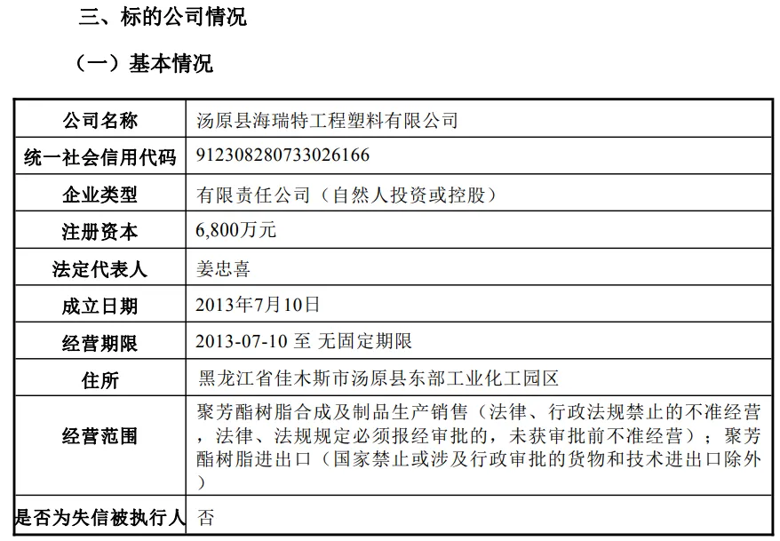 根据公告内容,海瑞特成立于2013年,注册资本为6800万元,法定代表人为姜忠喜。该公司主要从事聚醚醚酮(PEEK)特种树脂、聚芳醚酮(PAEK)低熔点特种树脂的合成,以及相关改性树脂的研发、生产和销售,属于高新技术企业。其拥有200余吨/年的高品质PEEK树脂及PAEK低熔点树脂工业化生产能力,产品主要应用于航空航天、汽车、电子电气、能源、医疗器械等多个领域。