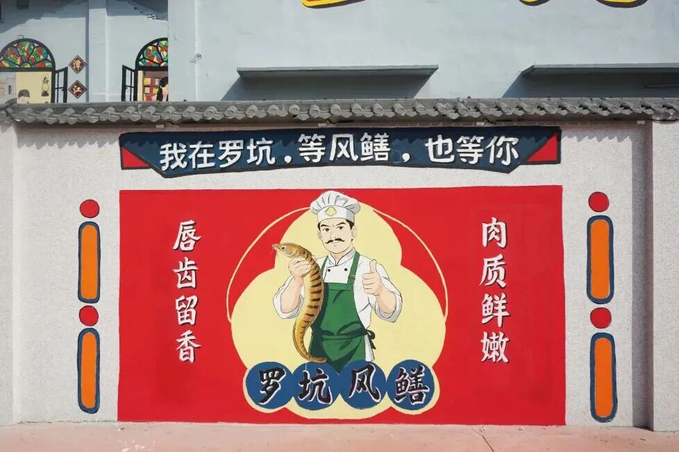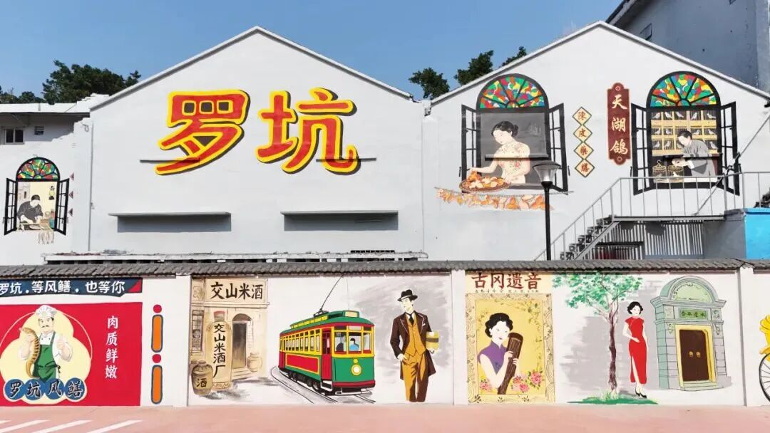 这些深受大家喜欢的墙绘,以本土的历史文脉、民俗风情和特色产业为创作基础,把石咀林氏家庙、岭南琴派文化、潭江美食等元素融入到绘画中,让每一面墙都成为讲述罗坑故事的“流动名片”。