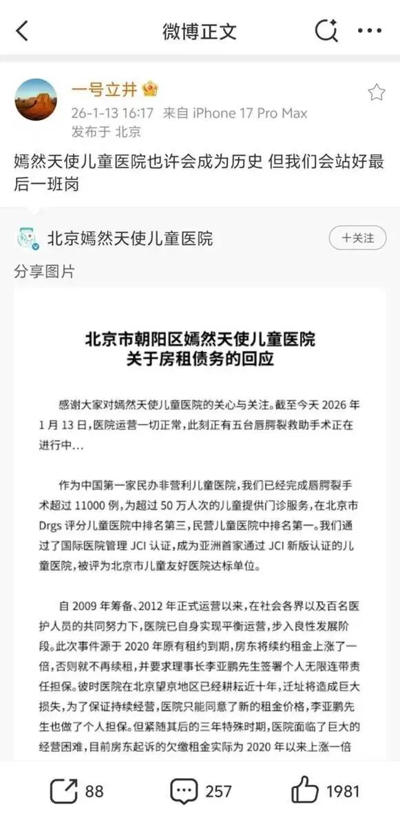 这场舆论的惊天逆转,始于一则视频。2026年1月14日,李亚鹏发布31分钟无剪辑视频《最后的面对》,详细讲述北京嫣然天使儿童医院因拖欠2000万租金面临迁址甚至关停的困境,透露医院十年完成11000台唇腭裂手术,7000名患儿全额免费治疗,过去5年已支付租金2500万。