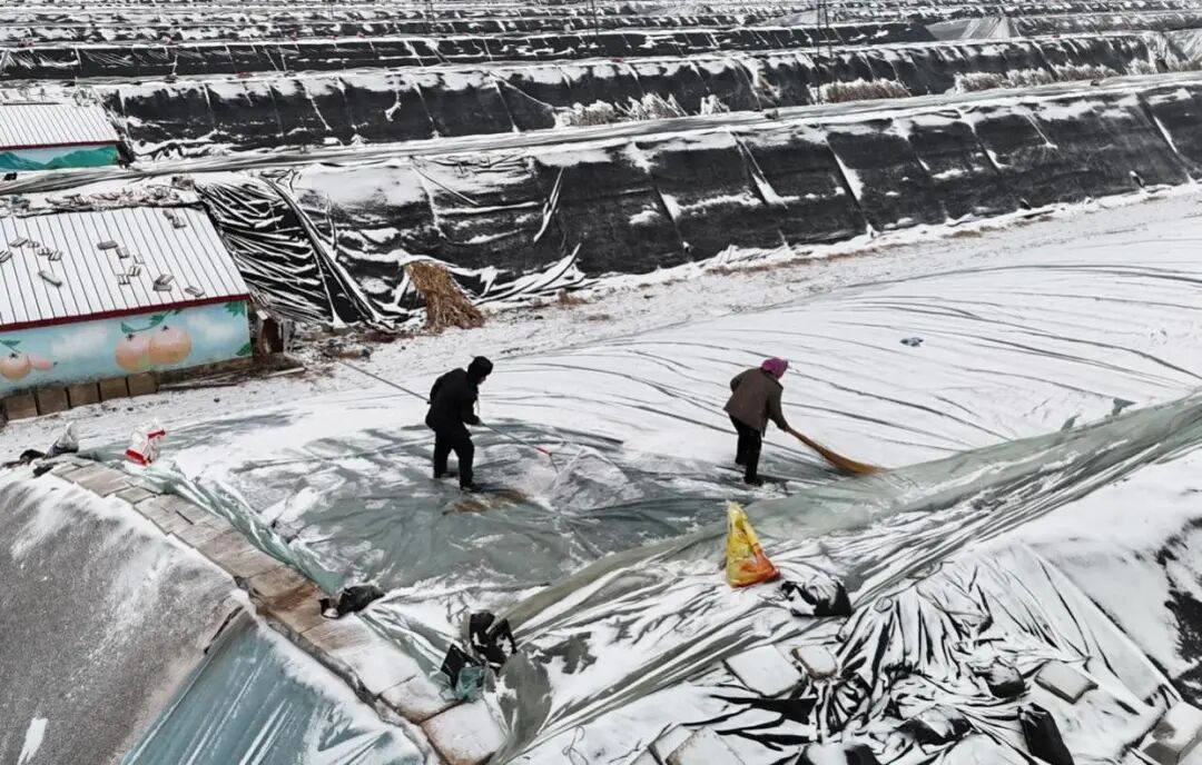 2026年1月19日,山东省滨州市滨城区杨柳雪镇的农民正在清理玉米囤苫盖上的积雪。(初宝瑞/人民图片)
