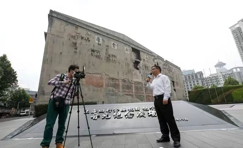 上图为2020年5月18日,云游“四行”直播首站,张众带领观众在四行仓库抗战纪念馆西侧弹孔墙下,讲述墙上8个炮弹孔和420余个枪弹孔背后的抗战故事。