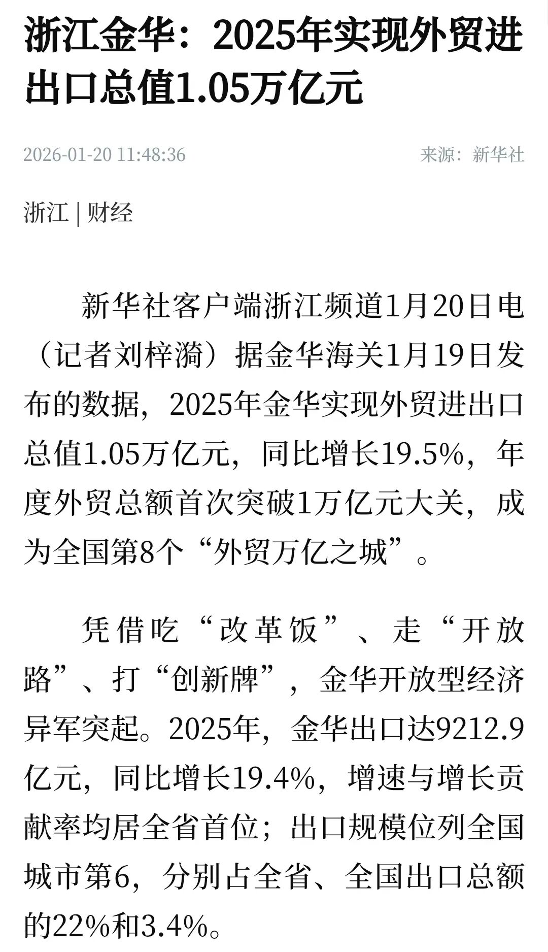 1月20日,新华社客户端推出《浙江金华:2025年实现外贸进出口总值1.05万亿元》,关注金华2025年外贸进出口总值突破1万亿元,成为全国第8个“外贸万亿之城”。