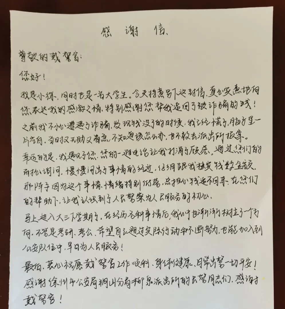锦旗上写着“一身藏蓝一身责,戴sir靠谱没话说”,感谢信里则提到“希望通过自己的努力也能加入公安队伍”