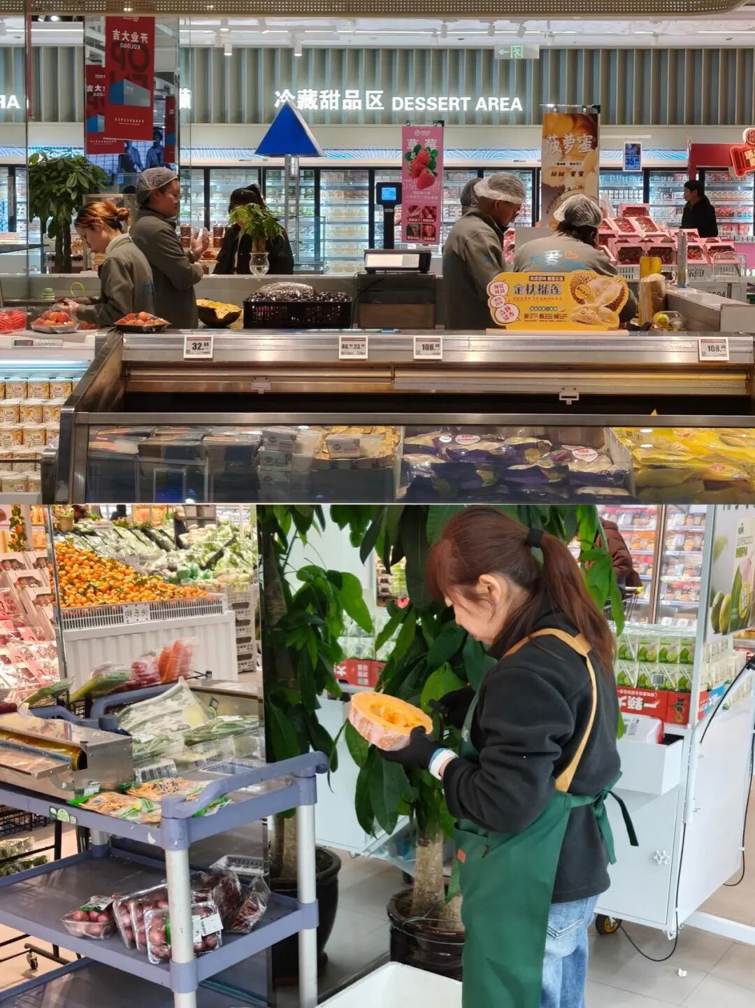 实探中还发现,工作日下午果切区仍有员工实时现切补货,生鲜区工作人员持续补货并挑拣蔬菜杂质。这些日常营运细节,值得传统超市借鉴。