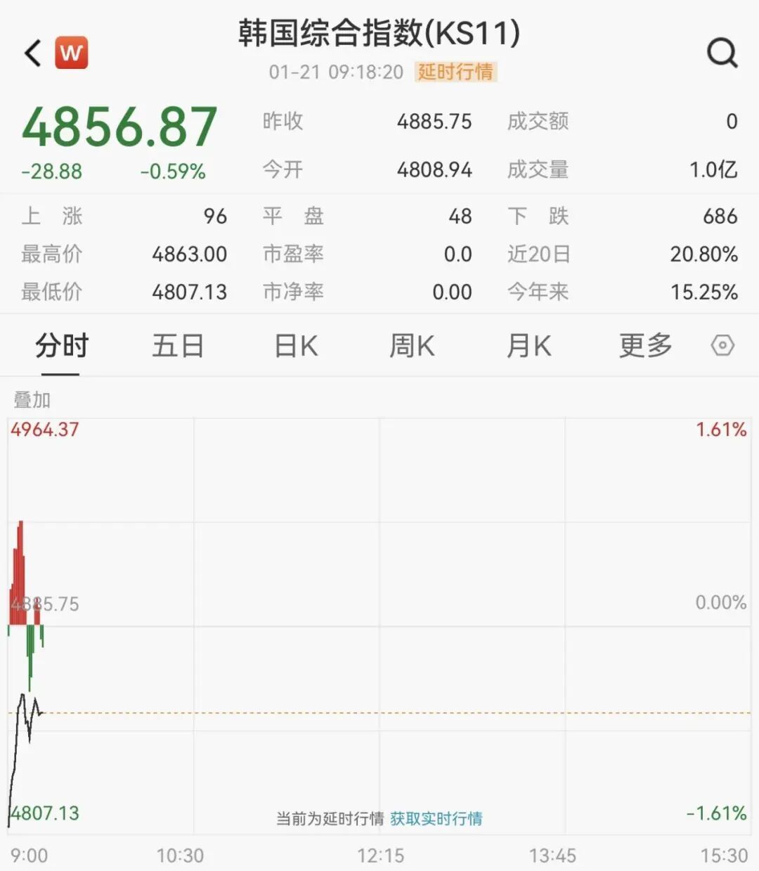 韩国综合股价指数开盘下跌1.6%,不过随后出现震荡回升的走势。