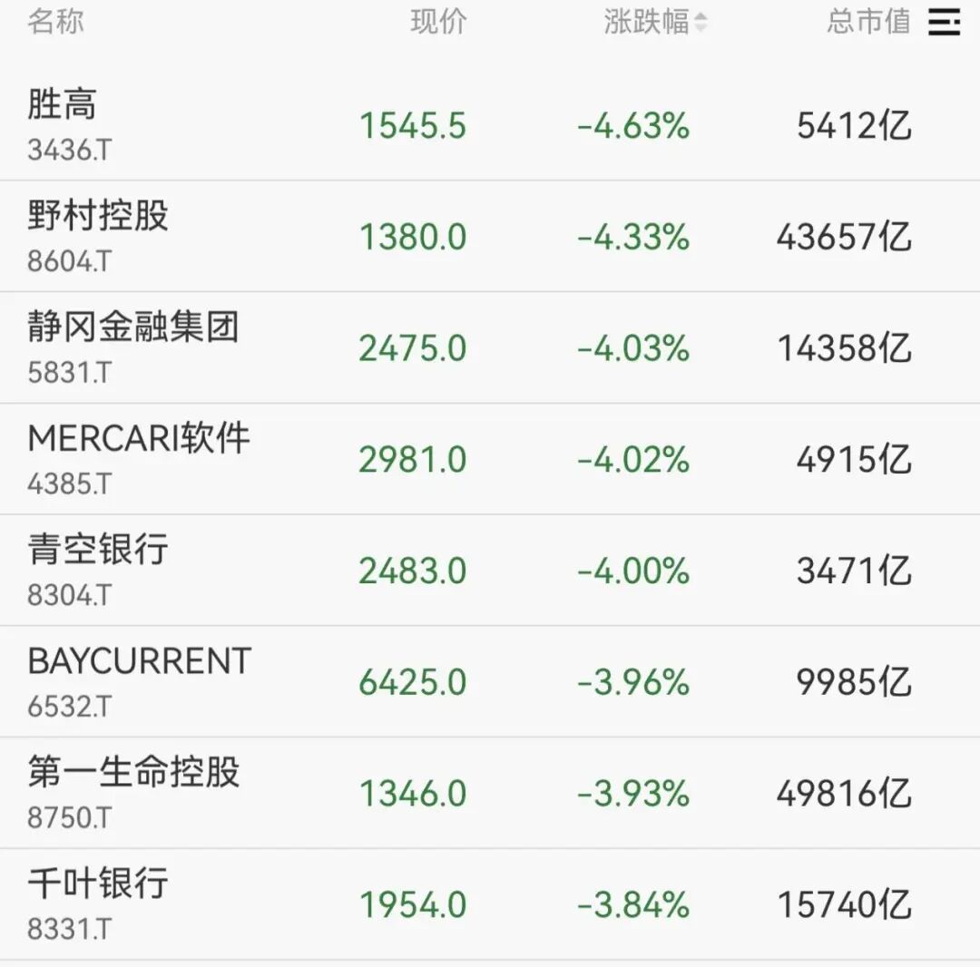 从个股表现来看,金融板块跌幅最为显著,野村控股、静冈金融集团、青空银行等多家金融机构股价跌幅均超过4%。
