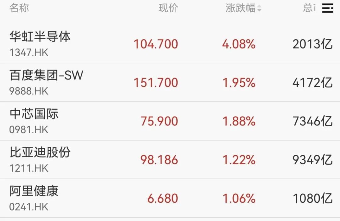 港股市场方面,三大指数走势分化,华虹半导体涨幅超4%,百度集团、中芯国际、比亚迪股份等个股同样表现亮眼,涨幅位居前列。
