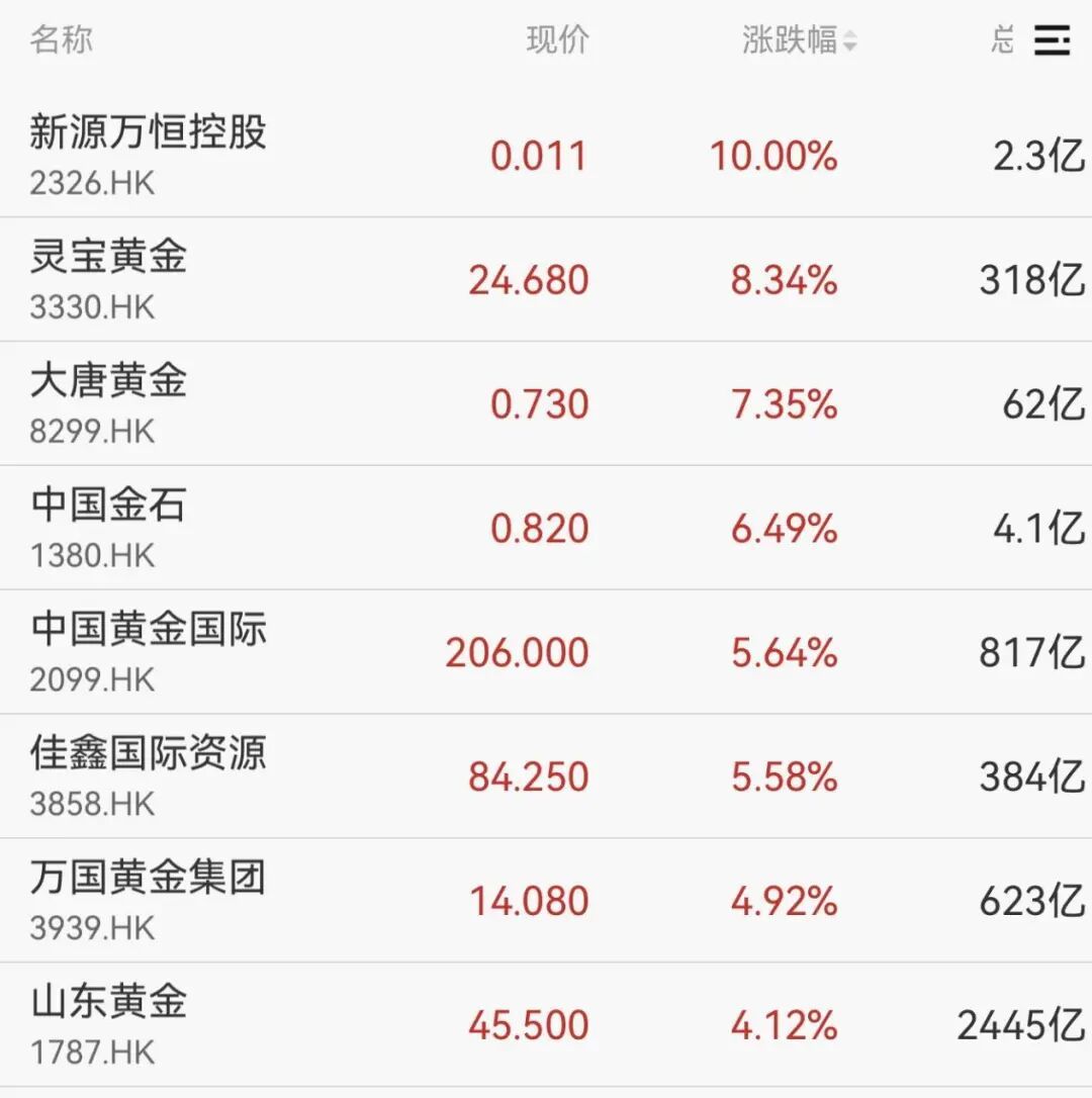 港股市场里,灵宝黄金、大唐黄金、中国金黄金国际等个股涨幅超5%。