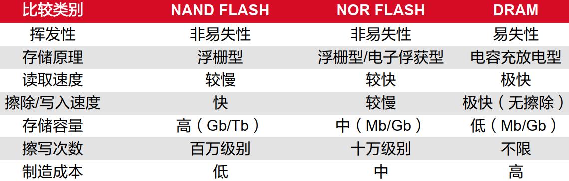 NOR由于支持随机访问,读取速度比NAND快;而NAND以块为单位进行擦除和写入操作,其擦除和写入速度比NOR快很多。NAND内部电路更简单,因此数据密度大、体积小,成本也低,市场上一些大容量的FLASH都采用NAND型,像大家常用的SSD、U盘、SD卡等。小容量的2M - 12M的FLASH多是NOR型,NOR比较适合频繁随机读写的场合,通常用于存储程序代码并直接在闪存内运行。相比于Flash,DRAM具有较高读写速度、存储时间短等优势,但单位成本更高,主要用于PC内存(如DDR)、手机内存(如LPDDR)和服务器等设备。