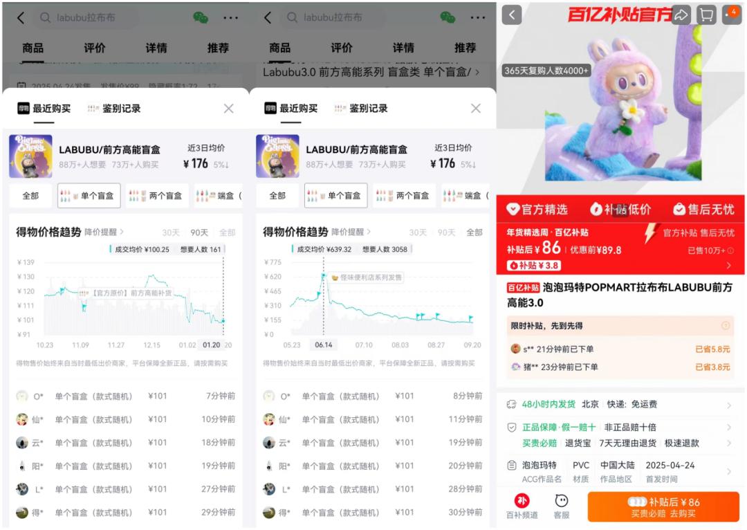 更值得注意的是,天猫“百亿补贴”频道中,一款未拆盒、未拆袋的LABUBU盲盒最低售价仅86元,甚至低于泡泡玛特的官方零售价。