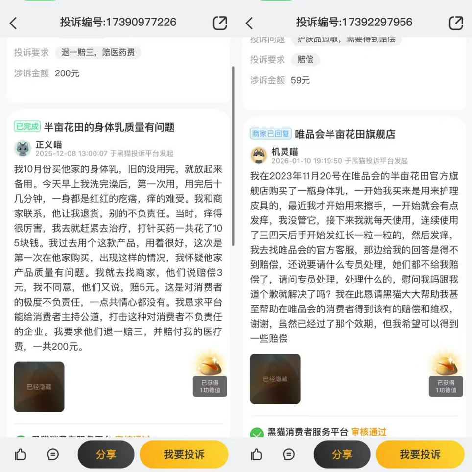 在第三方消费者投诉平台上,涉及半亩花田的投诉累计近300条,主要集中在产品使用后引发皮肤过敏及售后服务质量差等问题。社交平台上,不少消费者表示,因产品价格较低,遇到问题往往只能“自认倒霉”。