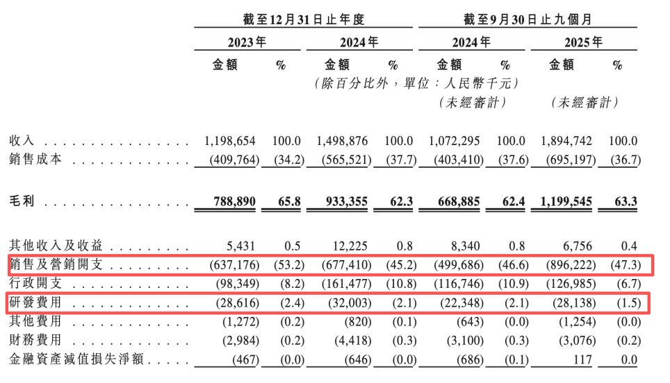 数据显示,2023年至2025年前9个月,公司销售及营销开支分别为6.37亿元、6.77亿元和8.96亿元,占总收入的比例分别为53.2%、45.2%和47.3%,常年占据收入近半的份额;反观研发投入,同期仅为2862万元、3200万元和2800万元,占收入的比重从2023年的2.4%下滑至2025年前9个月的1.5%。尽管美妆行业“重营销”现象较为普遍,但半亩花田营销与研发投入的巨大差距仍较为突出,这种财务结构也成为市场评估其长期竞争力的关键。