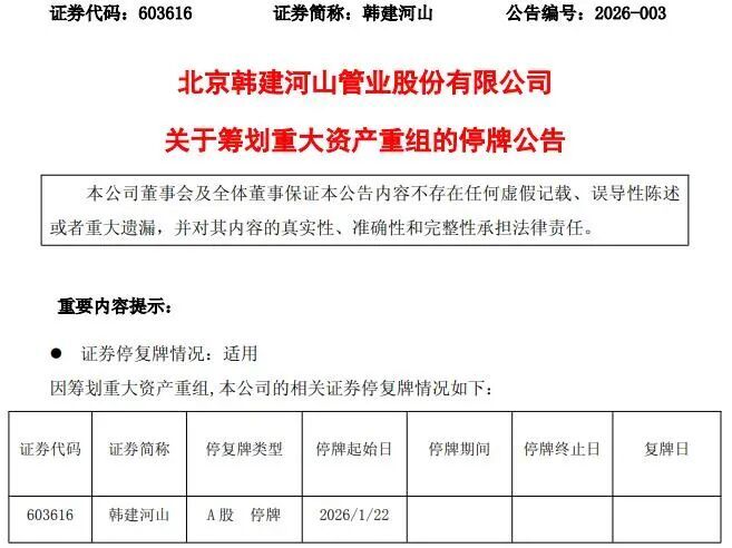 同一天,兴福新材也发布公告称正在筹划控制权变更事项,即韩建河山拟通过发行股份及支付现金的方式收购其52.51%的股权,以实现对兴福新材的控制及合并报表。交易完成后,韩建河山将成为兴福新材的控股股东。兴福新材股票自1月21日起停牌,预计于2月4日前复牌。