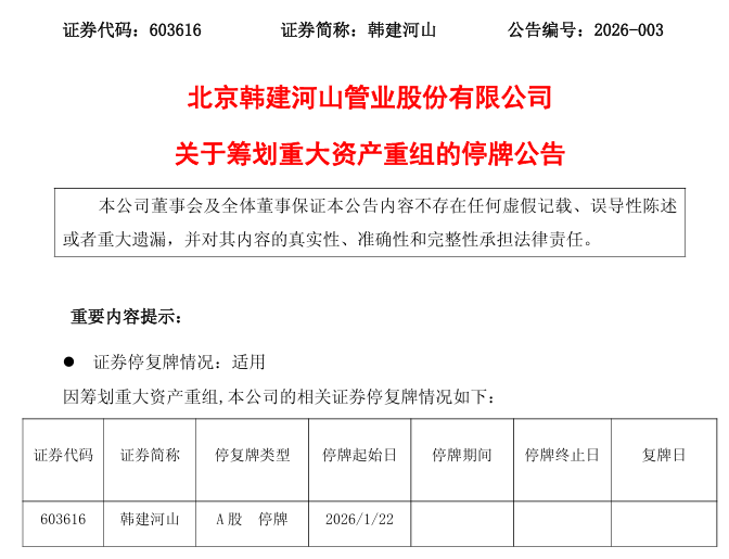 鉴于本次交易目前仍处于筹划阶段,相关事项存在不确定性。为保障投资者利益,防止股价出现异常波动,根据上海证券交易所的相关规定,经公司申请,公司A股股票(证券简称:韩建河山,证券代码:603616.SH)将于2026年1月22日(星期四)开市起停牌,预计停牌时长不超过9个交易日。
