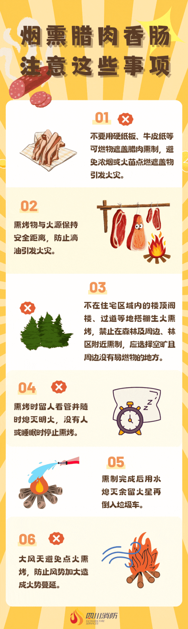 “人不离火、火不离人”是铁规矩!熏制时千万不要随意离开,吃饭、睡觉前一定要彻底熄灭火源。