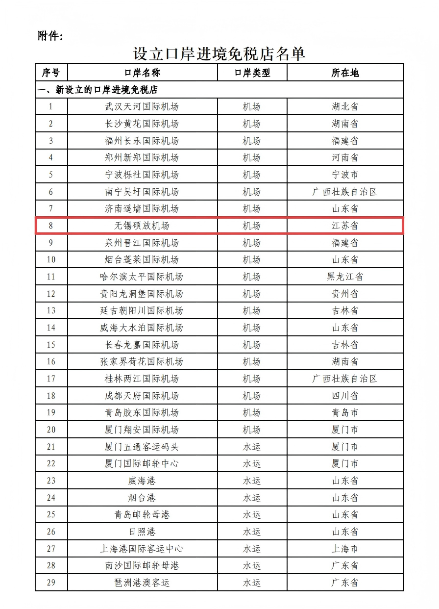 近日,财政部、商务部、文化和旅游部、海关总署、税务总局五部门联合发布《关于口岸进境免税店有关事宜的通知》,其中明确了一批新设立及调整的口岸进境免税店名单,无锡硕放机场成功入选新设立口岸进境免税店之列。