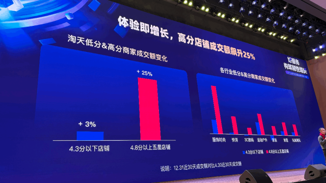 2025年数据显示,淘宝天猫好服务商家的用户复购率、净GMV均为低服务水平商家的两倍。对比“真实体验分”上线前后的店铺表现(2025年12月31日近30天成交额 vs 2025年4月30日近30天成交额),4.8分以上的五星店铺GMV增长25%,4.3分以下店铺仅增长3%,且高分店铺多为中小商家。服饰、快消、家居等行业高分商家成交额均有提升,扶优战略正帮助优质原创商家通过好服务实现增长。
