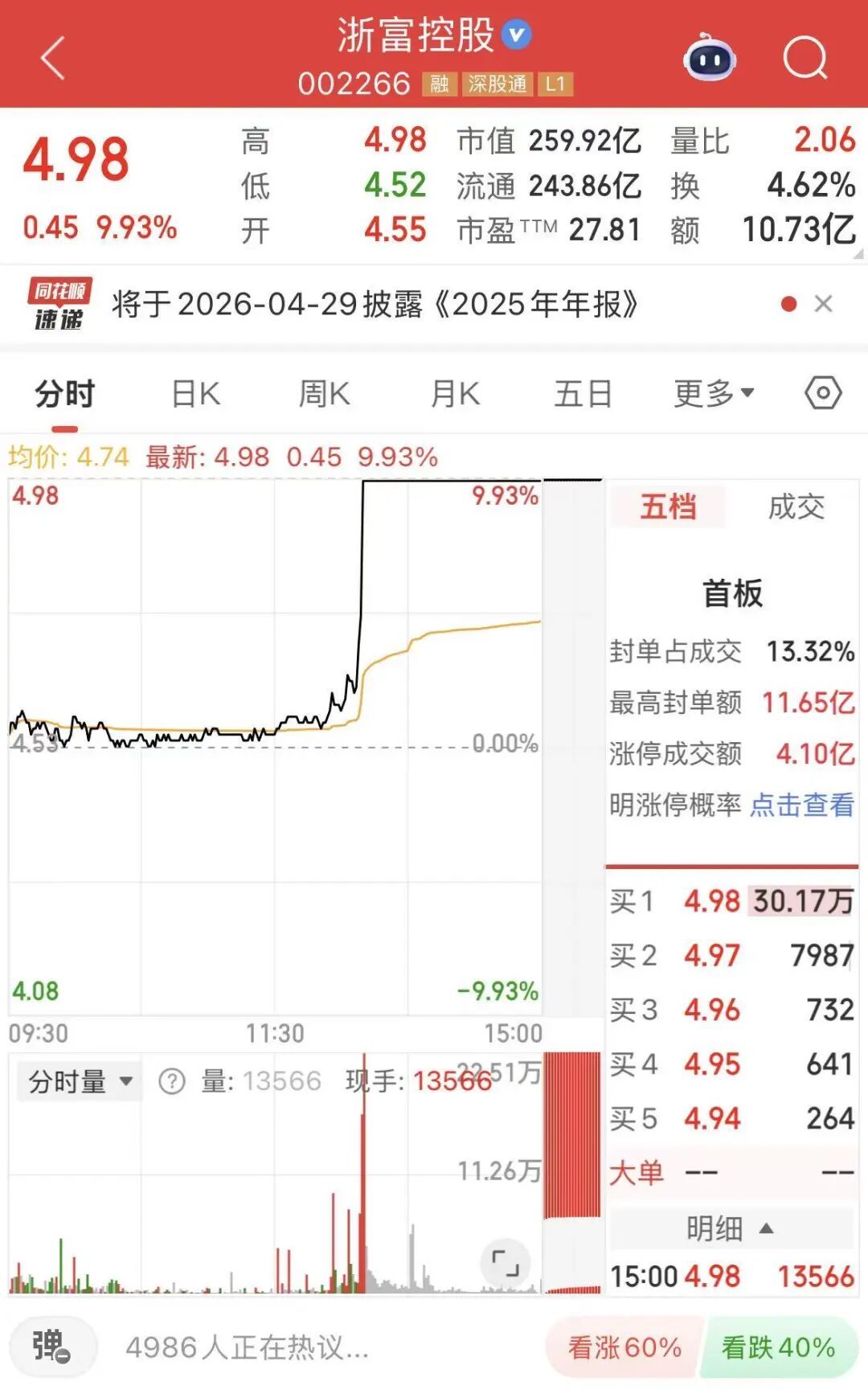 可控核聚变板块在午后震荡上行,浙富控股于13:36突然直线拉升,仅用4分钟就在13:40封死涨停,截至收盘,涨停板上的封单量超过30万手。