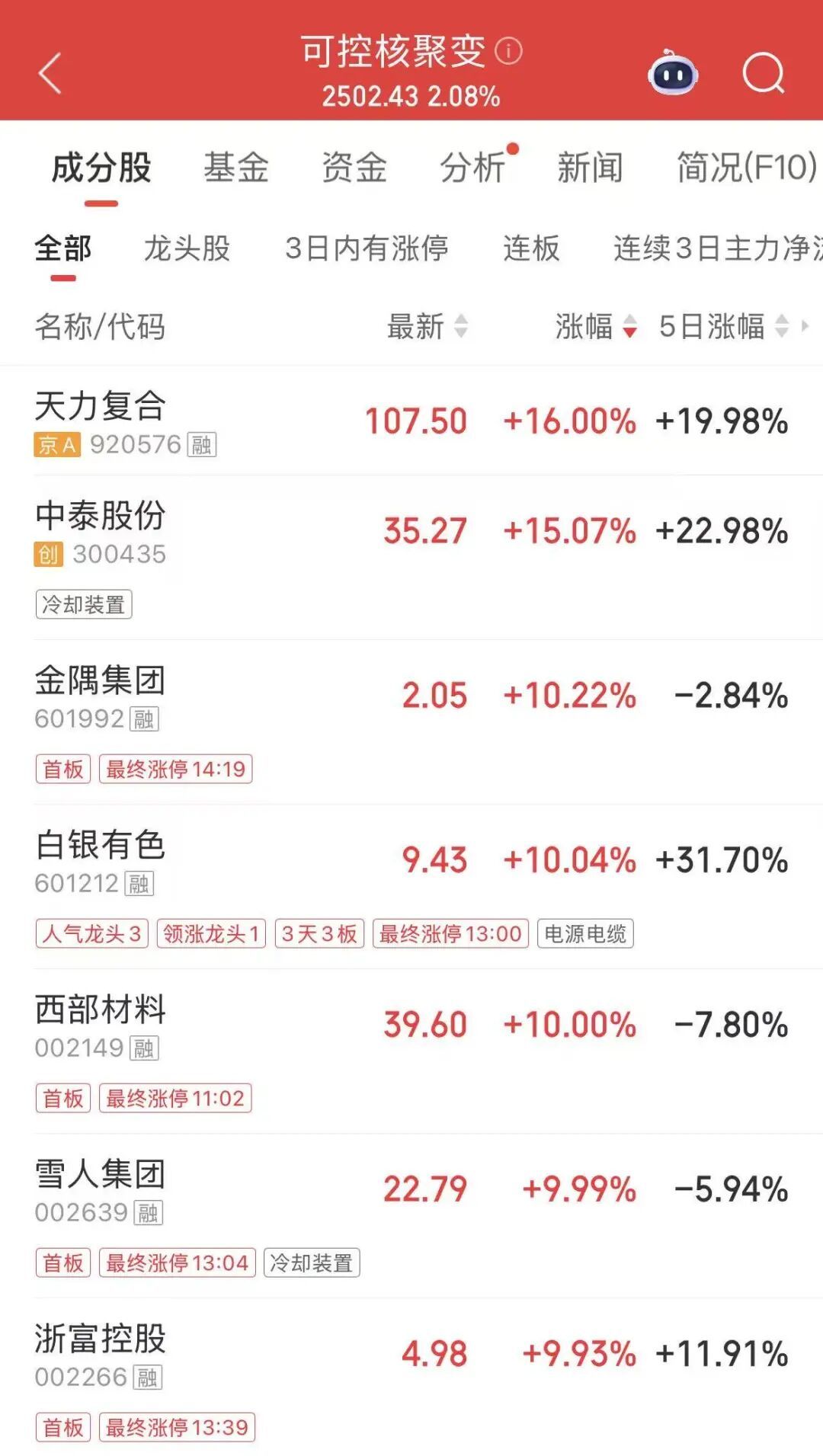 今日午后,可控核聚变板块震荡上行,浙富控股直线封停;收盘时,雪人集团、西部材料等也纷纷涨停。
