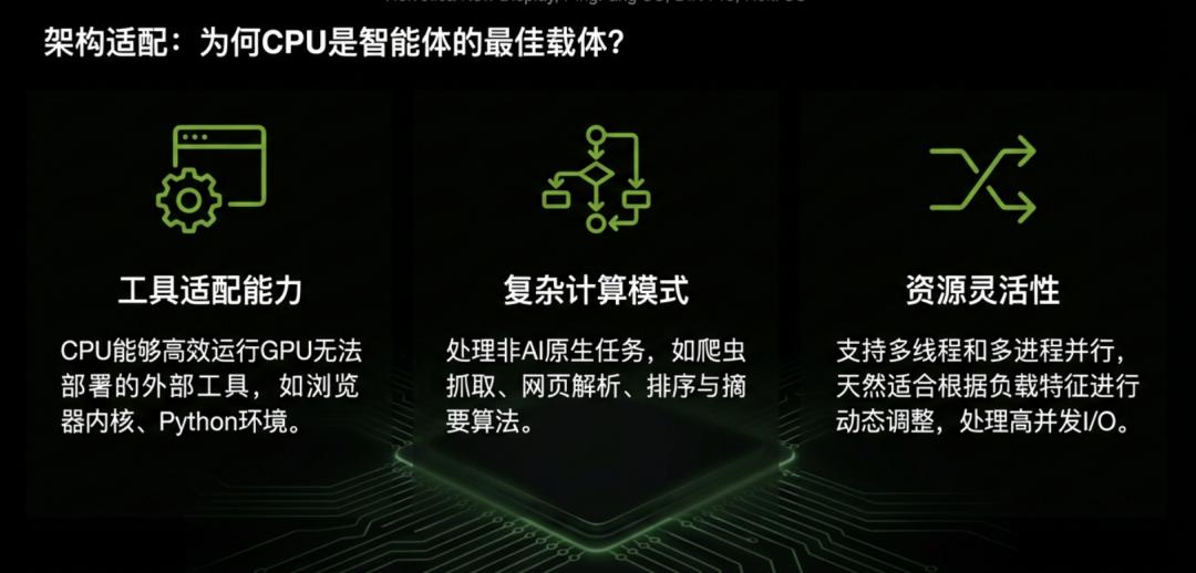 在智能体运行任务时,CPU的核心优势体现在对工具处理的适配能力、资源利用的灵活性以及对多种应用场景的兼容性上。CPU能够高效运行许多无法部署在GPU/TPU/NPU上的计算任务和外部程序工具,例如网页搜索、Python执行、精确向量/数据搜索等。
