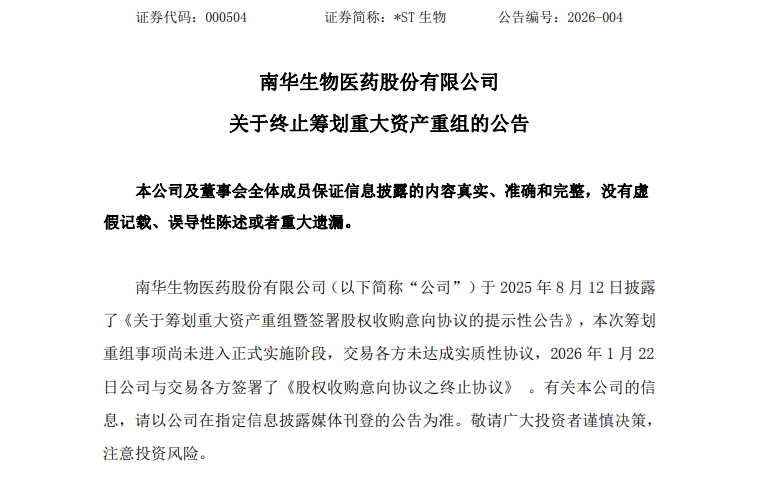 *ST生物于1月22日发布公告称,公司曾在2025年8月12日披露《关于筹划重大资产重组暨签署股权收购意向协议的提示性公告》,但本次重组事项尚未进入正式实施阶段,交易各方也未达成实质性协议。