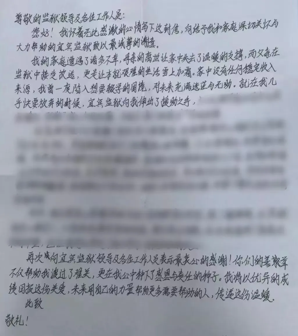 “……我曾陷入辍学困境,对未来迷茫无助,是宜宾监狱民警伸出援手,驱散阴霾、点亮求学希望。未来我也要传递这份温暖。”近日,一封高中生的感谢信寄到宜宾监狱,薄薄信纸承载着沉甸甸的真挚。这不仅是对民警帮扶的由衷致谢,更揭开了高墙后的温暖故事——民警以耐心叩开罪犯心门,用脚步丈量亲情距离,见证一对父子双向奔赴的新生。