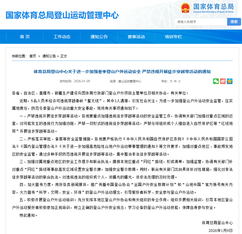 不久前,5人违规穿越秦岭“鳌太线”导致3人遇难的事件引发关注。国家体育总局登山运动管理中心已明确严禁一切违规徒步穿越活动,禁止擅自进入自然保护区等“红线地带”。