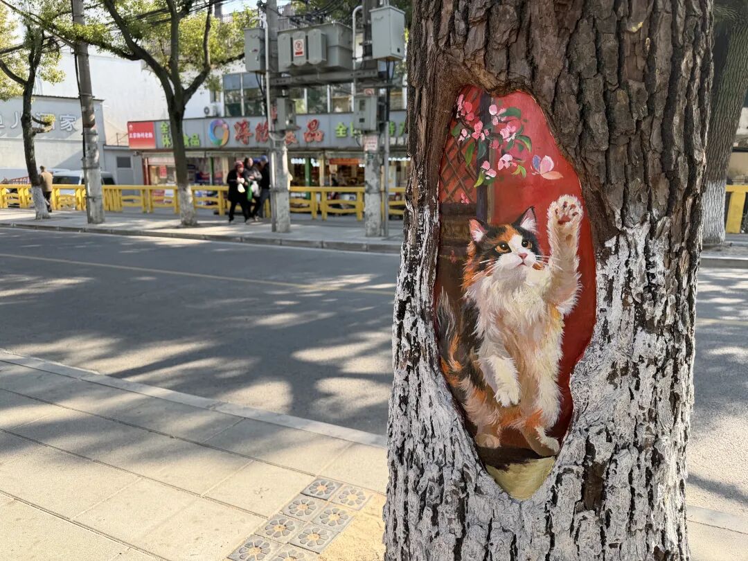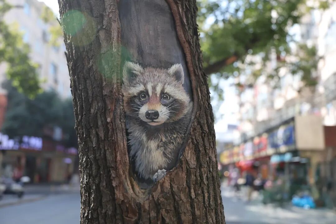 在画笔下,树洞变成了一个个奇妙小世界:温顺的兔子、机灵的花猫、憨态可掬的小浣熊……这些可爱的动物涂鸦,不仅遮住了树木的“伤疤”,还能治愈路人的疲惫。画师们说,创作这些作品是想传递“热爱生命、亲近自然”的理念,让大家在忙碌生活中慢下来,发现身边的美好。