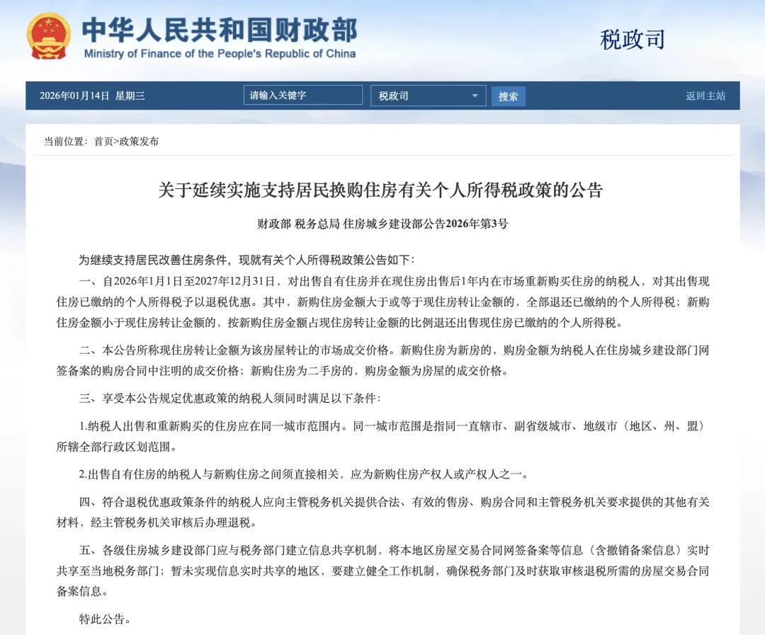 该公告明确,2026年1月1日至2027年12月31日期间,出售自有住房后1年内重新购房的纳税人,其出售现住房已缴的个人所得税可享受退税优惠。